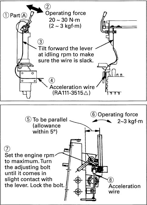 Adjusting the idling rpm Tilt the acceleration lever fully forward and make sure the acceleration wire gets free.